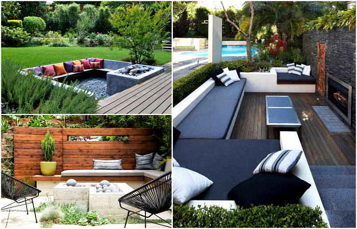 Простенькое местечко для отдыха с угловой скамьей из дерева и креативным кострищем, стоящим на ярком постаменте, которое несложно соорудить на своем участке этим летом.