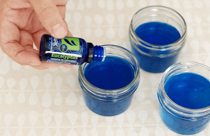 3. Остывшую жидкость разлейте по небольшим баночкам и в каждую добавьте 20 капель эфирных масел: по 5 капель лаванды, мяты, майорана и эвкалипта.